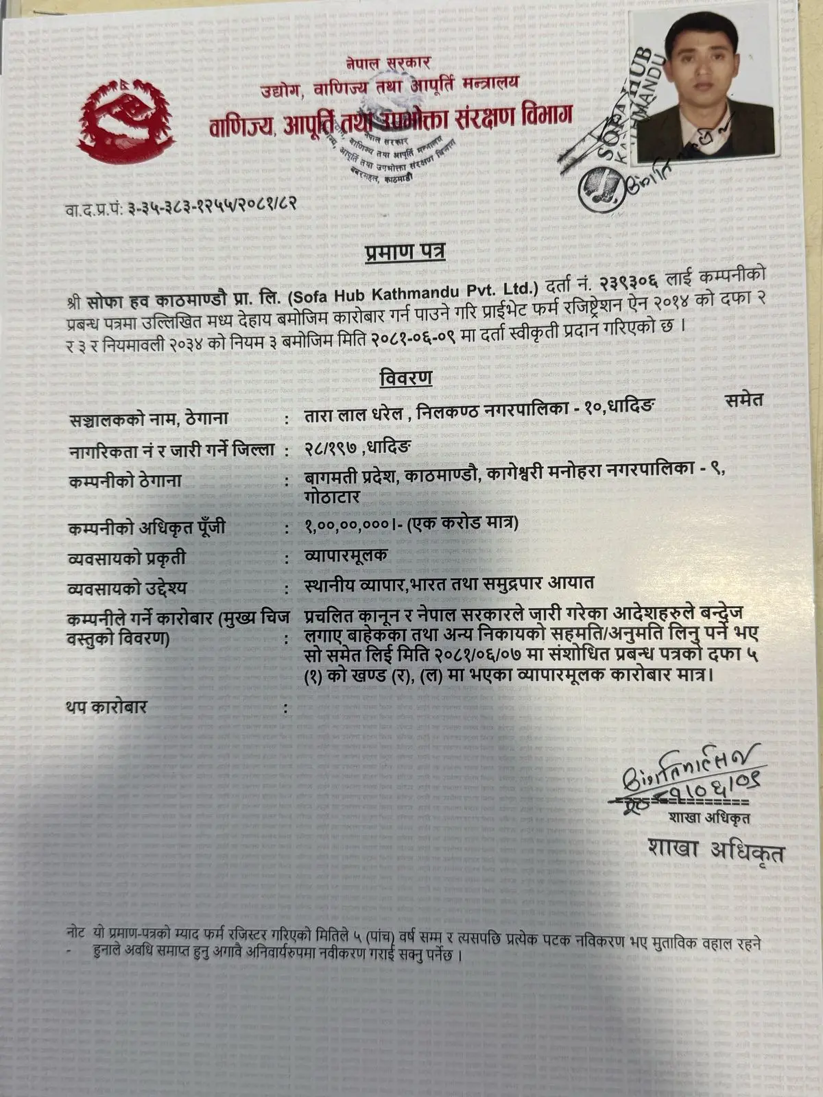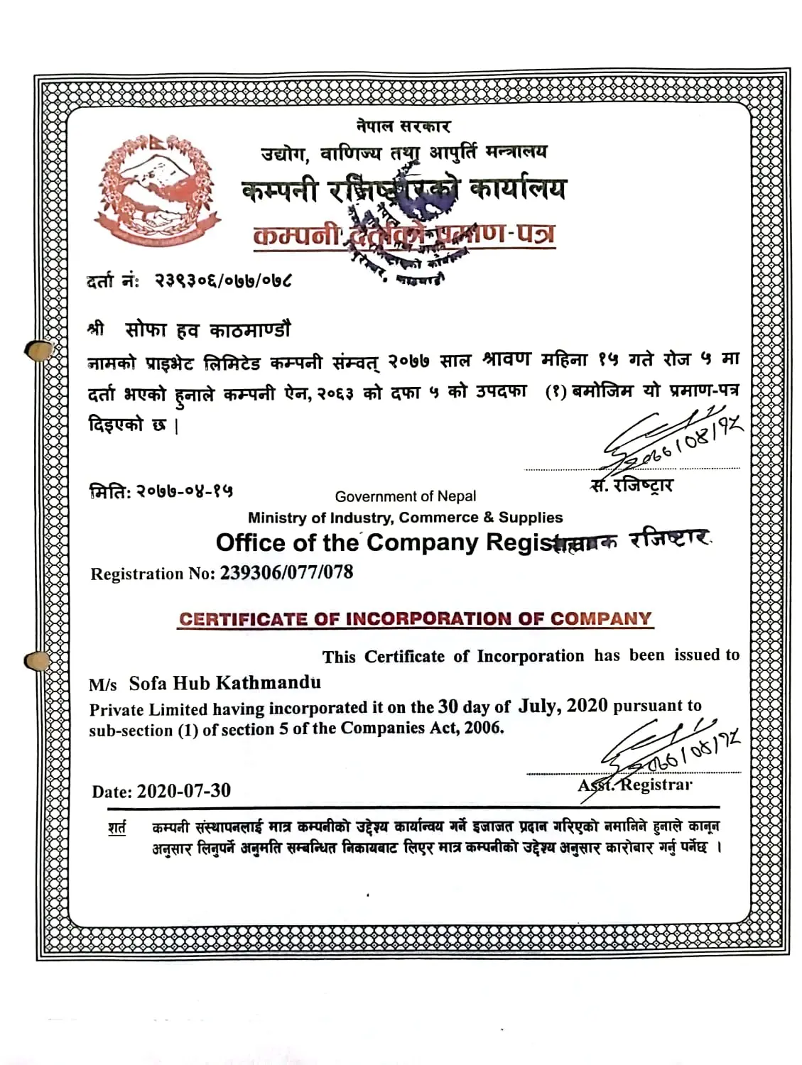 Ministry of Industry, Commerce & Suppliers Registration Certificate