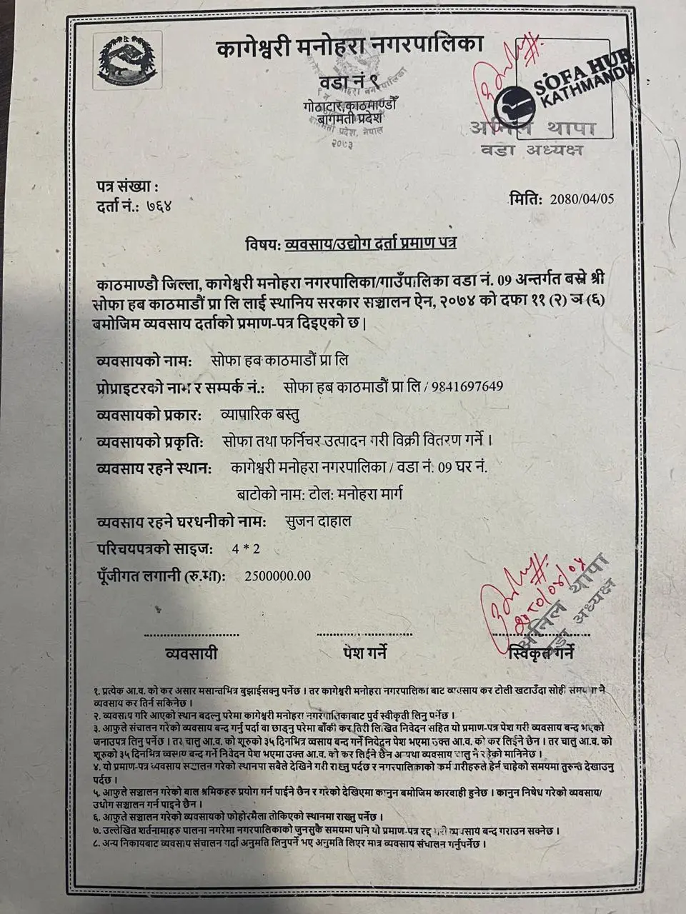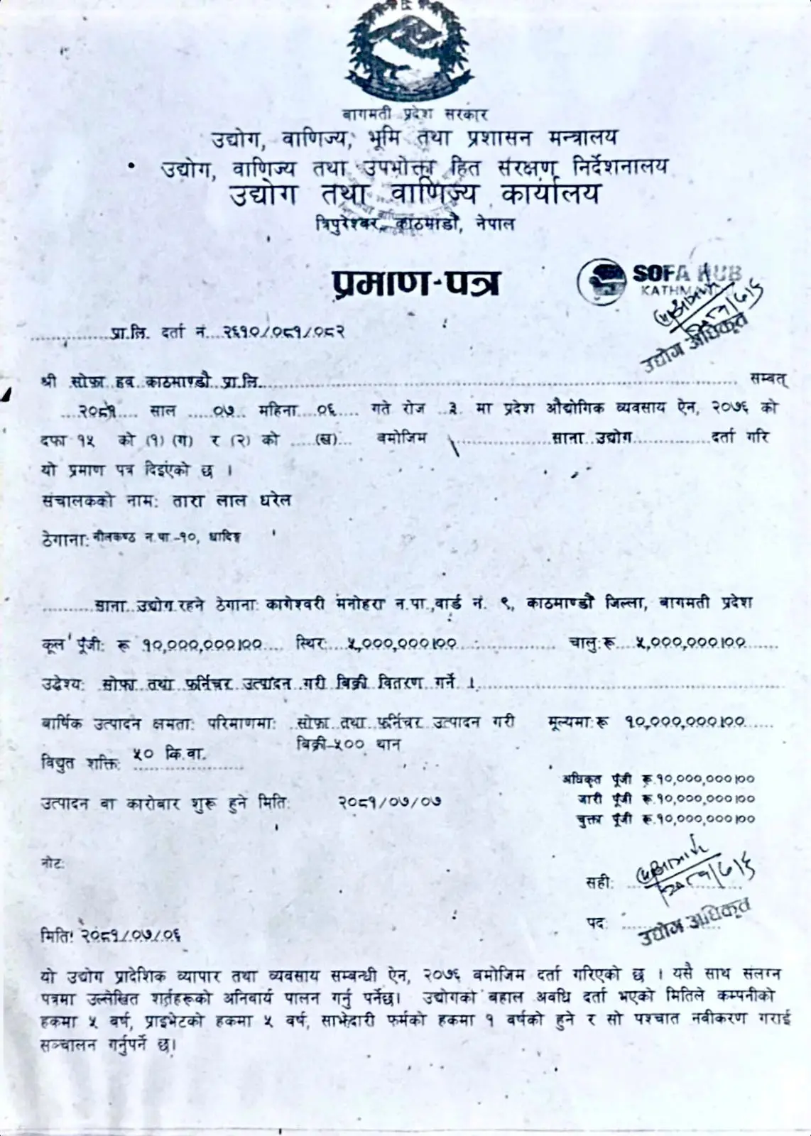 Home Industry Registration Certificate