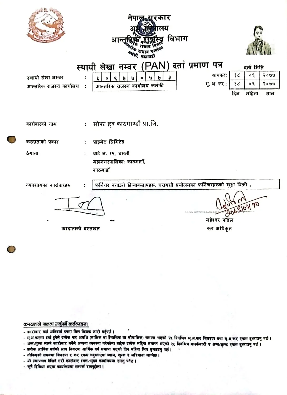 Pan Registration Certificate