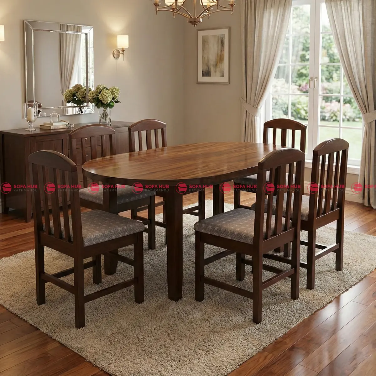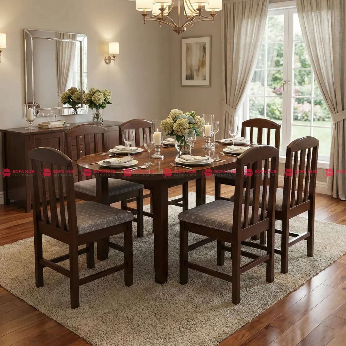 Enhance your dining experience with this elegant 6-Seater Round Wooden Dining Table Set, designed for families who value style, comfort, and durability. Crafted from polished premium hardwood, this dining set brings a warm, sophisticated charm to your space while staying budget-friendly. The smooth glossy finish adds a refined touch and makes everyday cleaning effortless.