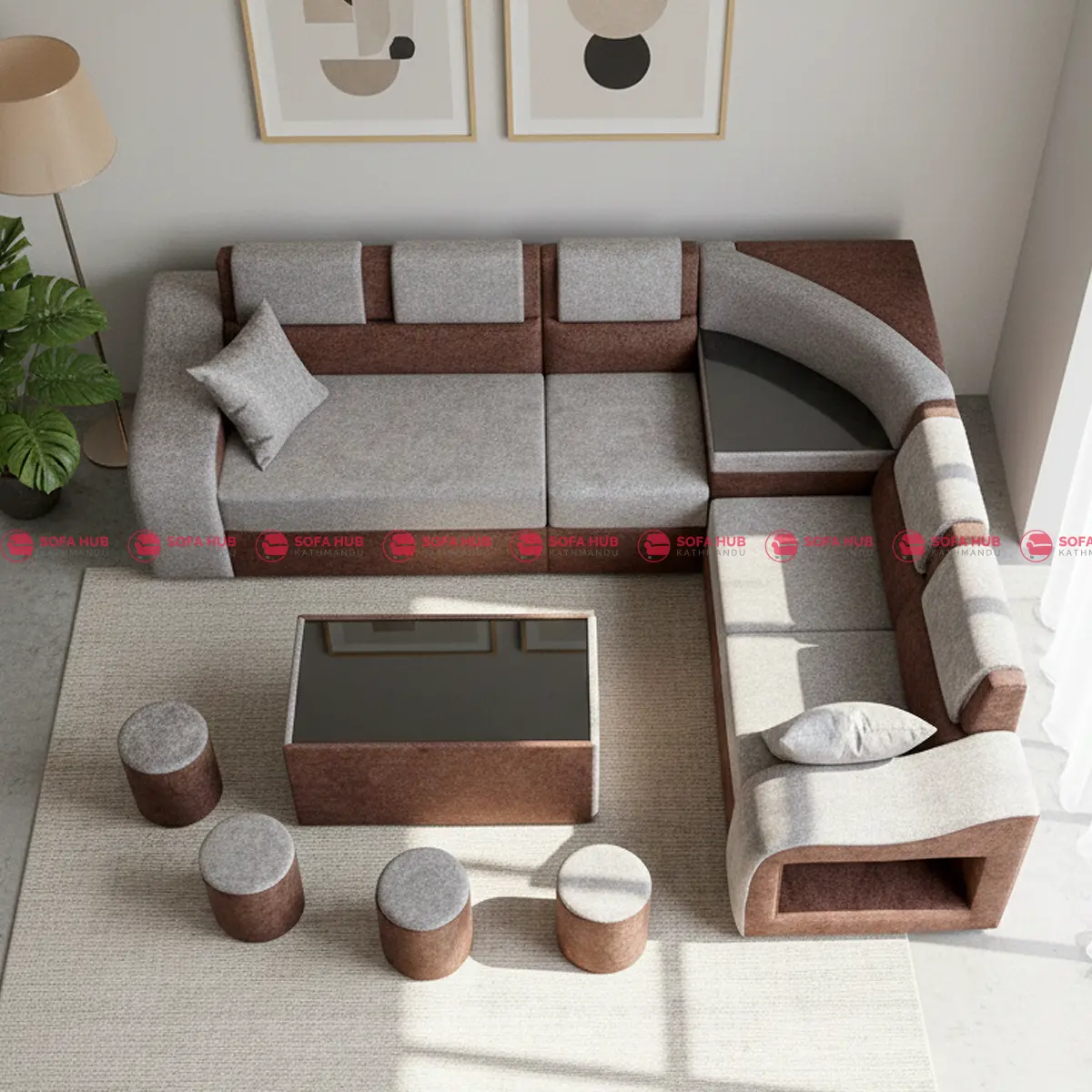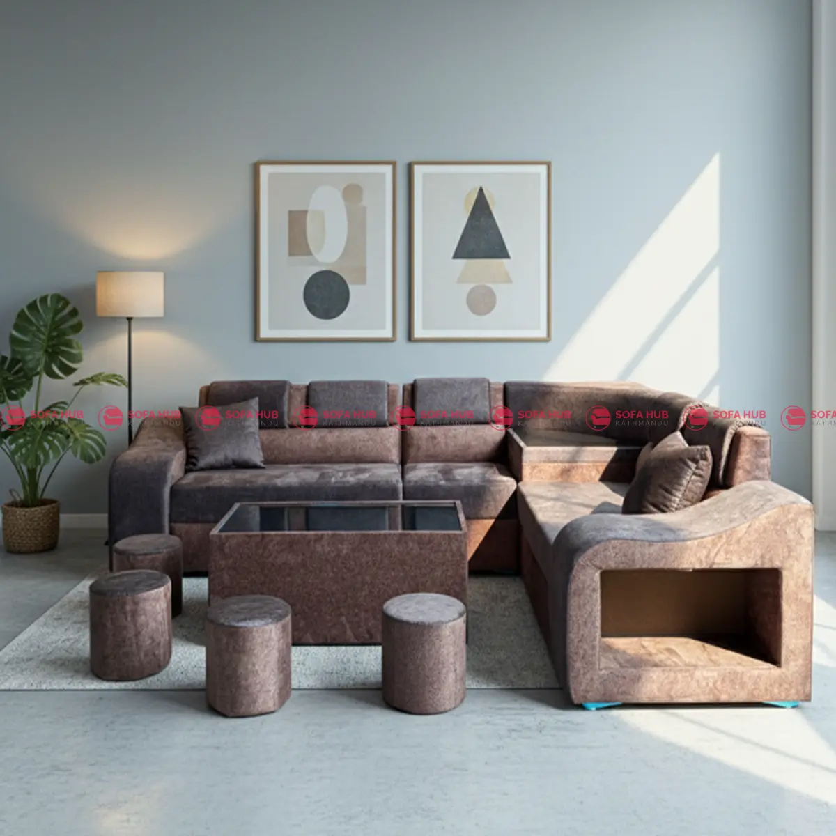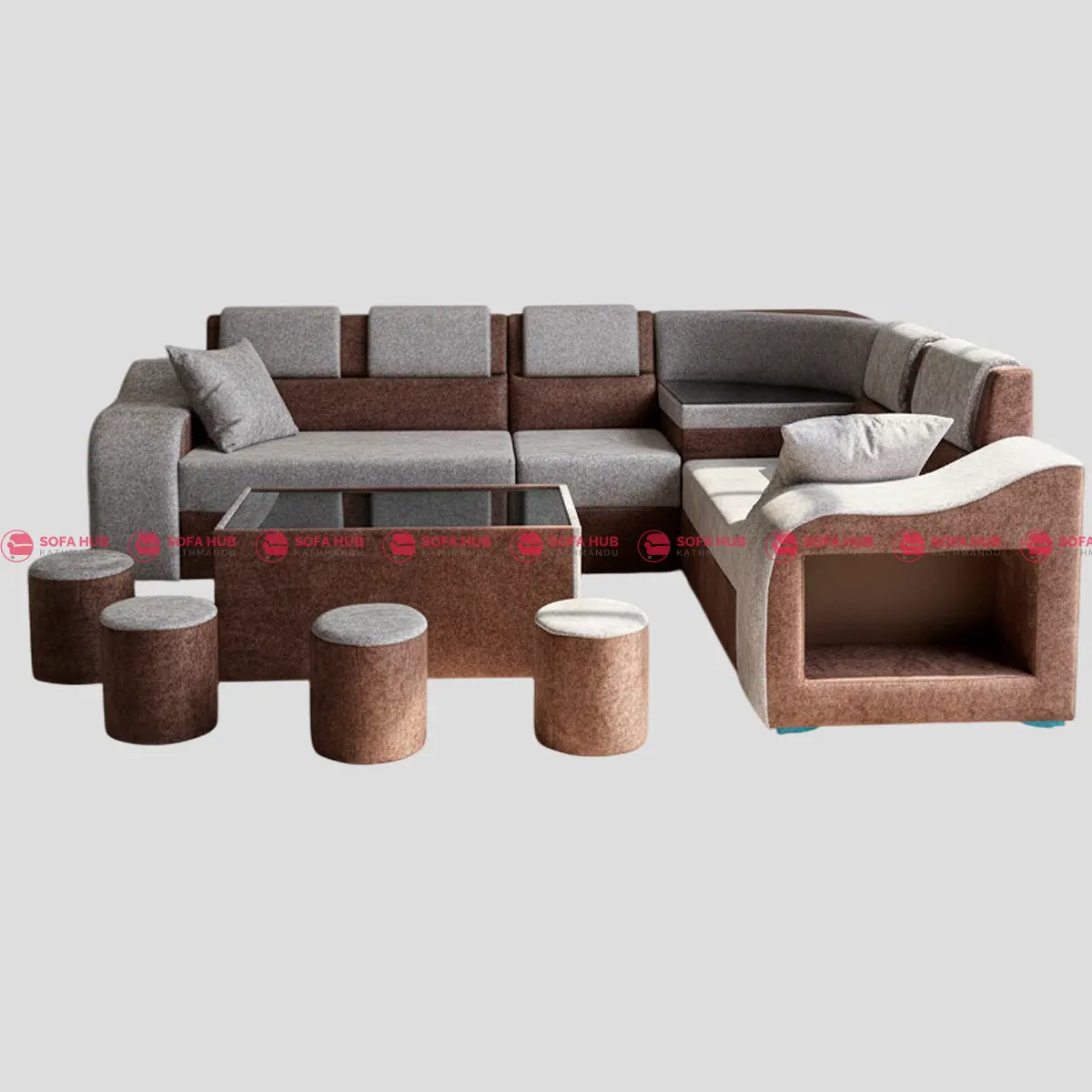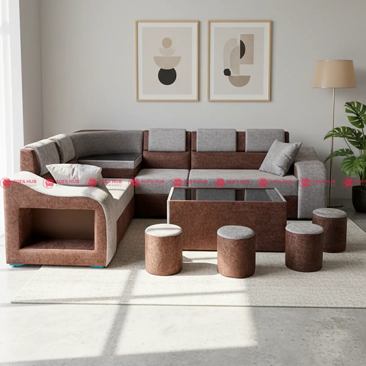 Elegant 7×9 ft Muda Corner Sofa Set with premium foam, strong wood frame, table, 4 muda stools, and 1 free tools. Comfortable, stylish, and backed with 5 & 10-year warranties.