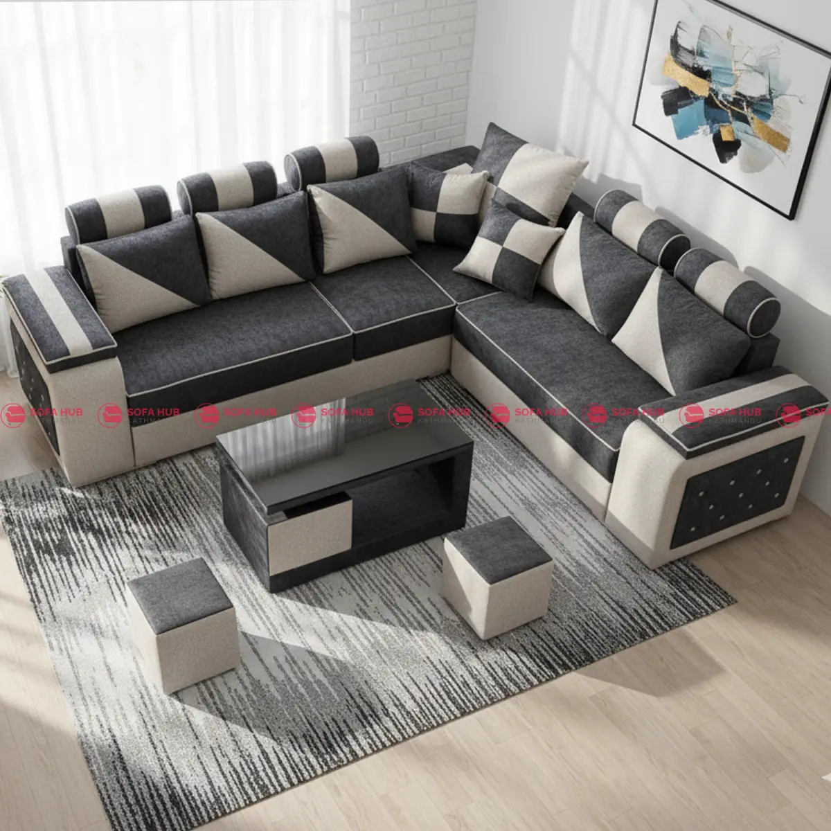 Premium L-Shaped Sofa (7×9 ft) with high-quality fabric, strong frame, 15-year warranty, modern design, and free delivery across major cities.